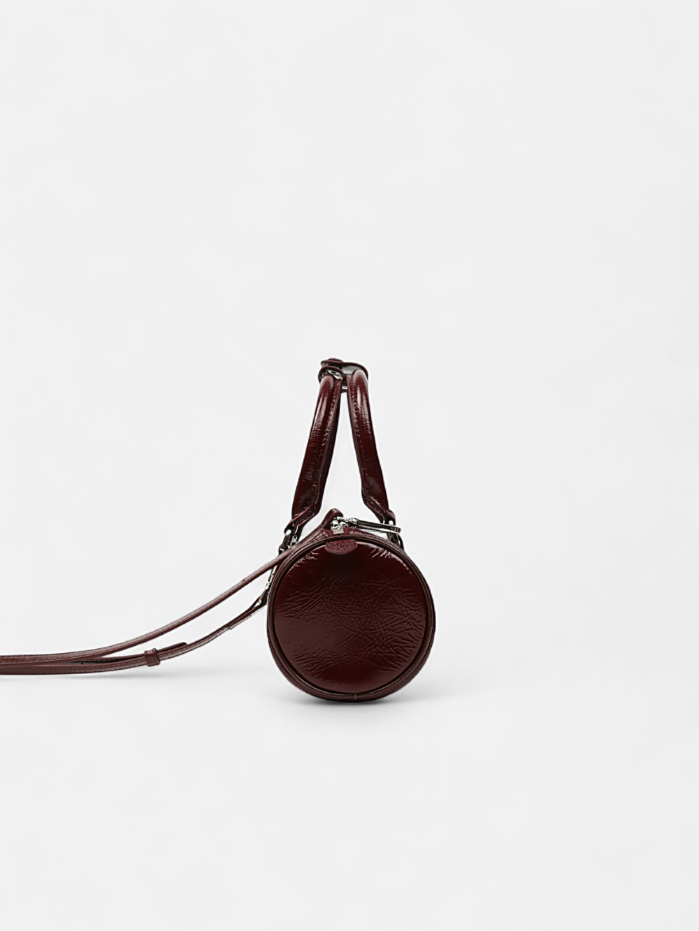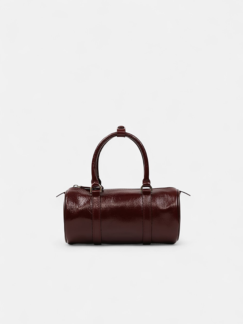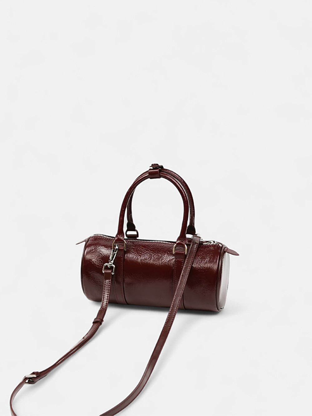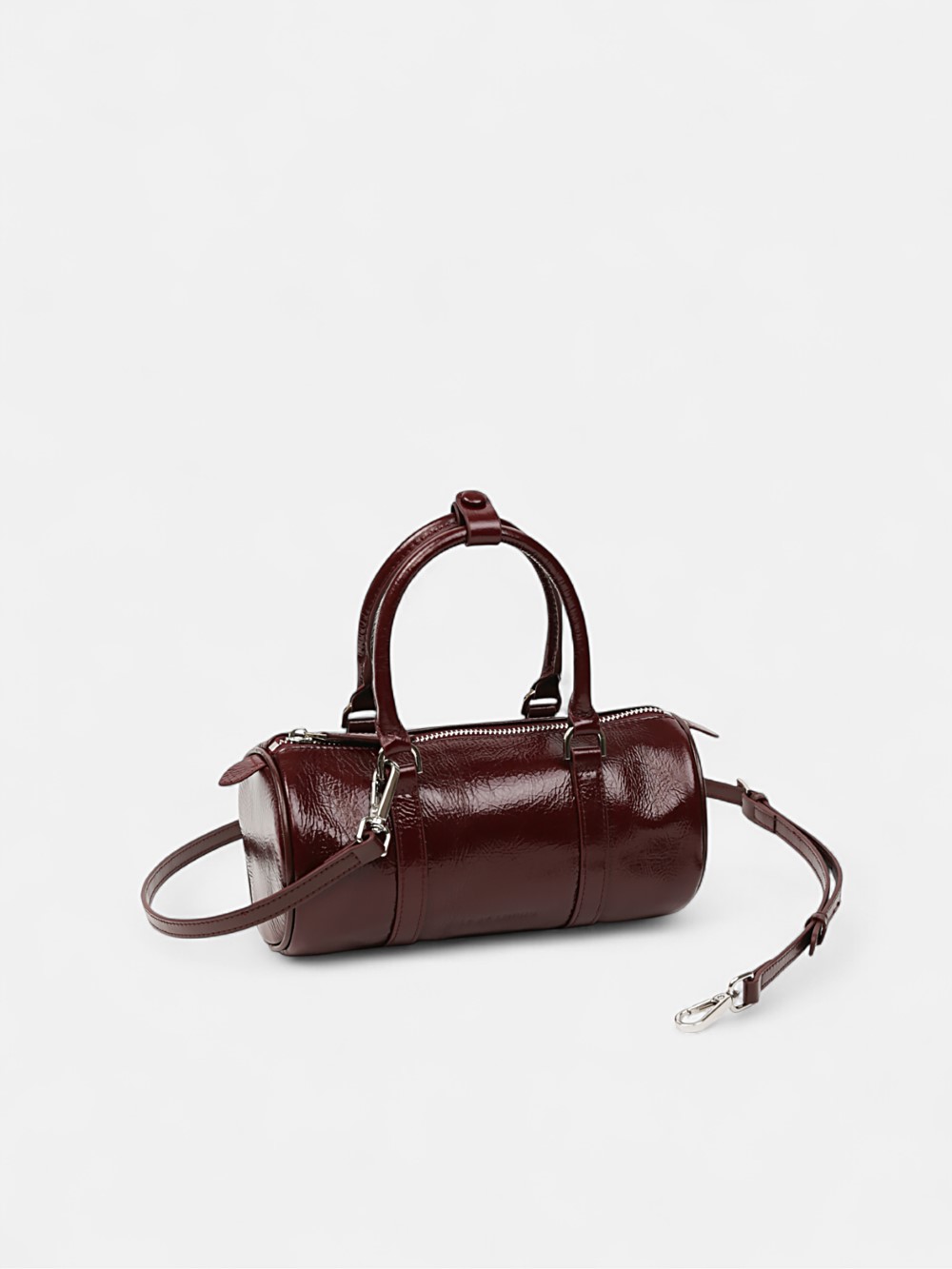 Mini barrel bag ánh kim LE BY LEMINO – phom trụ giữ dáng, khóa kéo an toàn, dây đeo tháo rời linh hoạt; nhỏ gọn nhưng đủ chỗ cho vật dụng mỗi ngày